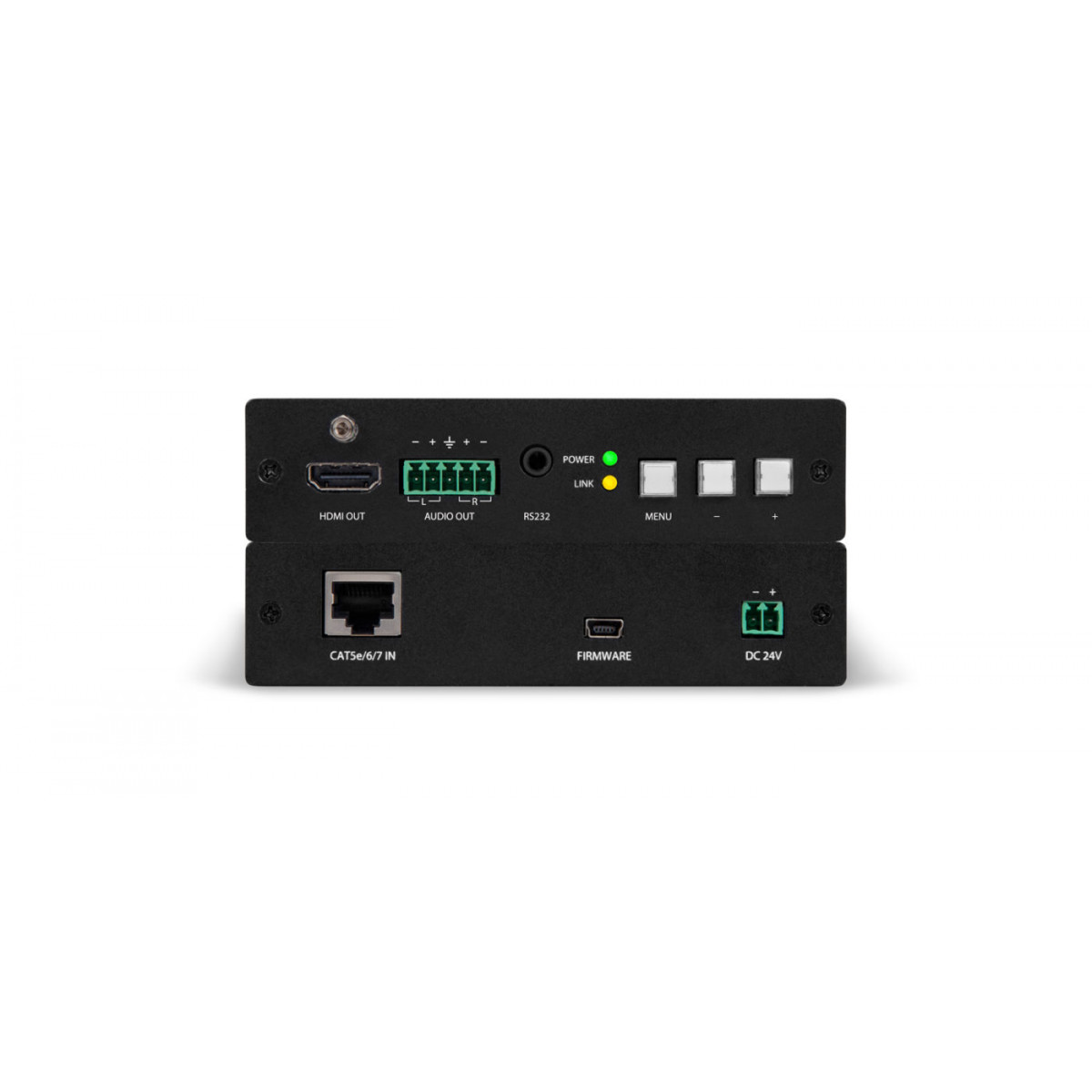 The Atlona AT-HDVS-RX is an HDBaseT™ scaler receiver for HDMI transmission over category cable. Receives AV signals up to 1080p/60Hz and 1920×1200 video with embedded multi-channel audio and control signals up to 230 feet (70 meters). Features include balanced analog audio de-embedding, RS-232 control, and Power over Category cable (PoCc) for sending remote power to the HDVS series transmitter. The receiver offers advanced scaling capabilities including image adjustment capability and an Auto-set feature for matching incoming signals to the display’s native resolution. Designed for use with the HDVS series transmitters, the transmitter/receiver pair enables auto display on/off, auto-switching, 3rd-party control, and other features. The built-in scaler works with matrix switchers to optimize source signals with different resolutions to a display’s native resolution. The AT-HDVS-RX is ideal for long distance transmission and display control in corporate or educational settings using analog and digital sources.