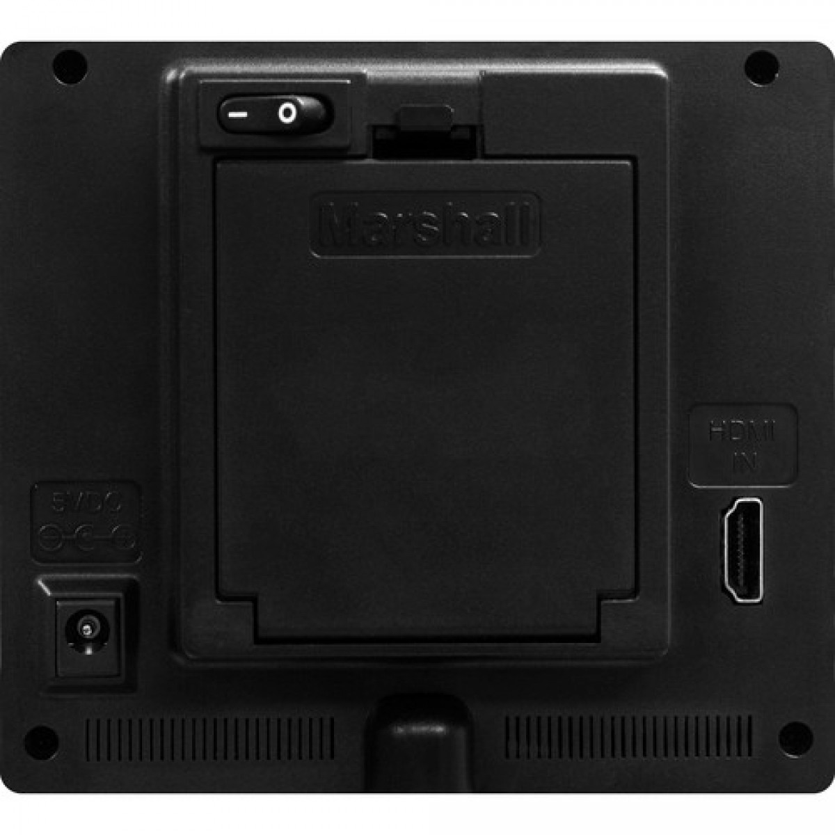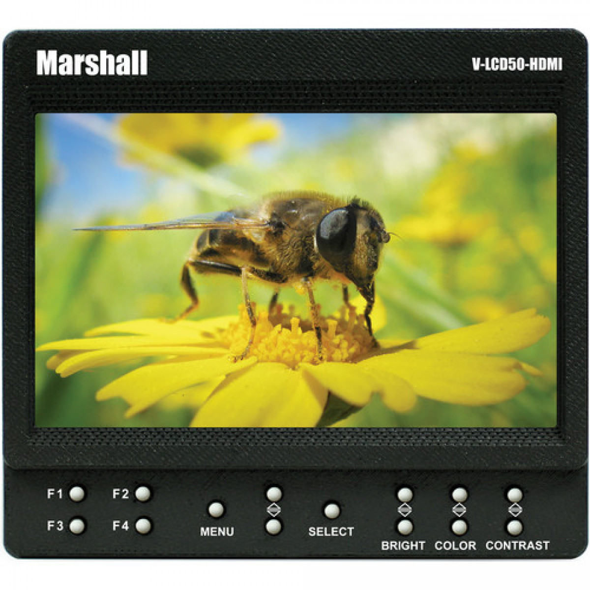 The Marshall 5 On-Camera Monitor is a high performance color monitor that mounts to the top of a camcorder or video DSLR using the provided shoe mount adapter. The monitor delivers superior brightness and sharpness, supports a wide range of formats and markers, and offers versatile viewing angles. Major monitor controls such as brightness, contrast, and color are easily accessed from the monitor's front panel. There are also four preset keys so that the videographer can, at the touch of a button, instantly access often used functions.